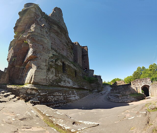 Dans la forêt des Vosges du Nord, un rocher de grès rose surgit des arbres comme la carène d'un navire retourné. Quatre-vingt-dix mètres de long, trente de hauteur, huit de large au sommet. Ce rocher vieux de deux cent quarante millions d'années ne porte pas un château, il est un château. Les bâtisseurs y ont taillé salles et escaliers, citernes et cachot, en creusant directement dans la masse pour en extraire les pierres qui construiraient les murs extérieurs. Fleckenstein est une forteresse semi-troglodytique : on y entre par le cœur même de la roche.