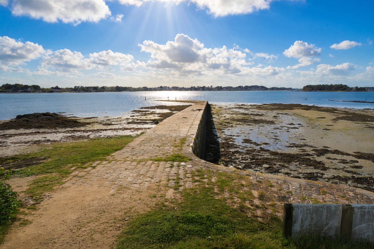 La digue du Berno avance sur l'eau, le moulin à son extrémité, un petit cimetière marin derrière lui. Au loin, l'île-aux-Moines. Plus loin, Gavrinis.